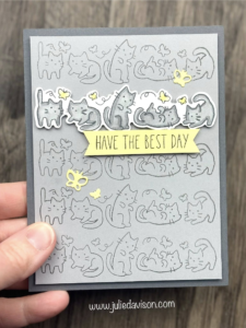I stamped the dog & cat images intermittently down the front of a piece of Smokey Slate cardstock in Smoky Slate ink. I die cut a strip of paw prints and added them to the bottom. I stamped the dogs and the sentiment on pieces of scrap white. Then I colored the dogs using my Stampin’ Blends and cut them out using the dies in the bundle (the dies are out of stock at the time of this writing, hence the reason they’re not listed below.) I added both white pieces on top of the Smoky Slate section then die-cut some flowers and butterflies to add for a finishing touch.
